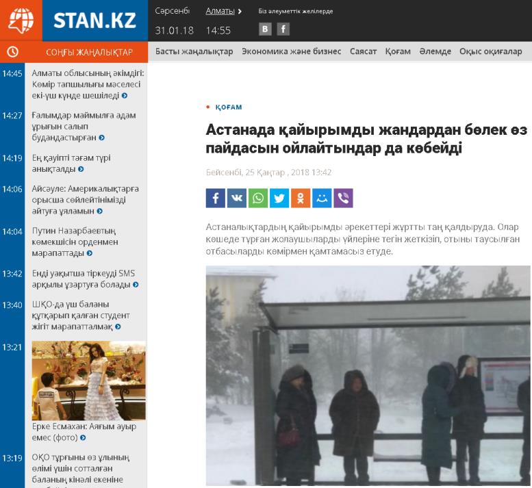 Астаналықтардың қайырымды әрекеттері жұртты таң қалдыруда. Олар көшеде тұрған жолаушыларды үйлеріне тегін жеткізіп, отыны таусылған отбасыларды көмірмен қамтамасыз етуде.
