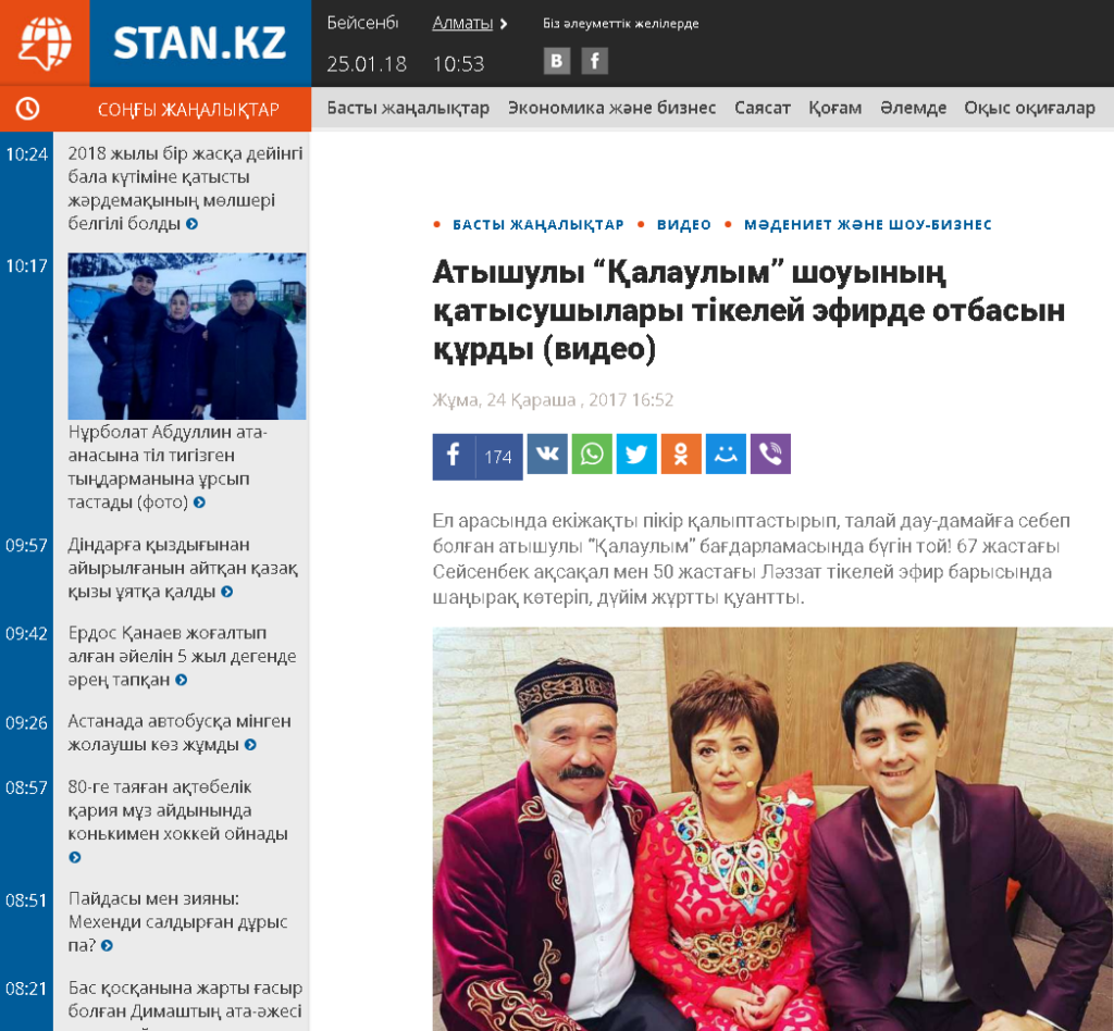 Ел арасында екіжақты пікір қалыптастырып, талай дау-дамайға себеп болған атышулы “Қалаулым” бағдарламасында бүгін той! 67 жастағы Сейсенбек ақсақал мен 50 жастағы Ләззат тікелей эфир барысында шаңырақ көтеріп, дүйім жұртты қуантты.