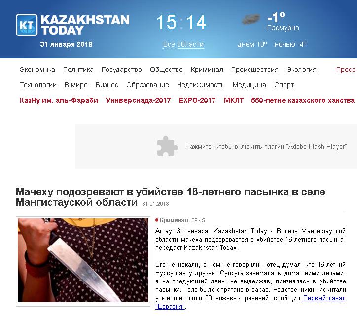 Актау. 31 января. Kazakhstan Today — В селе Мангистауской области мачеха подозревается в убийстве 16-летнего пасынка, передает Kazakhstan Today.