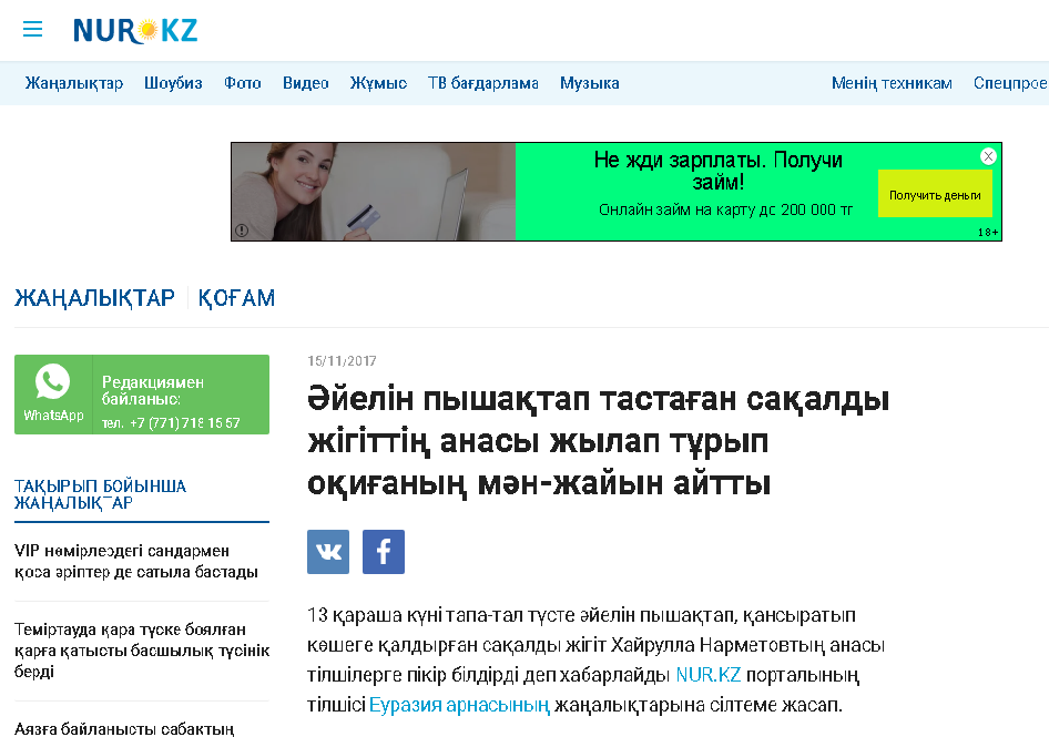 13 қараша күні тапа-тал түсте әйелін пышақтап, қансыратып көшеге қалдырған сақалды жігіт Хайрулла Нарметовтың анасы тілшілерге пікір білдірді деп хабарлайды NUR.KZ порталының тілшісі Еуразия арнасының жаңалықтарына сілтеме жасап. Қамауға алынған Хайрулла Нарметов Жәмила Нарметованың жалғыз ұлы екен. Келінімен ұлының отау құрғандарына 11 жылдың жүзі болғанымен, жақында ажырасып тынған. Умида екі баласын алып төркініне кетіп қалыпты. Ал Хайрулла құрылыста жалданып жұмыс істеп жүрген.