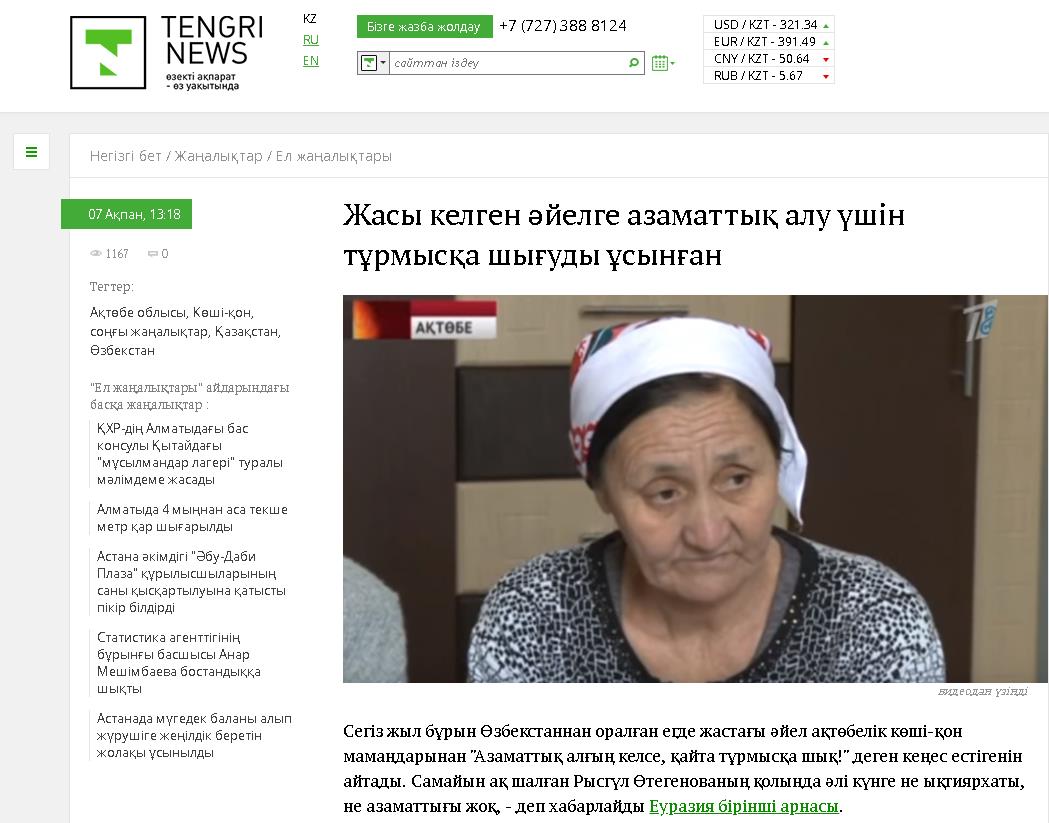 Сегіз жыл бұрын Өзбекстаннан оралған егде жастағы әйел ақтөбелік көші-қон мамандарынан «Азаматтық алғың келсе, қайта тұрмысқа шық!» деген кеңес естігенін айтады. Самайын ақ шалған Рысгүл Өтегенованың қолында әлі күнге не ықтиярхаты, не азаматтығы жоқ, — деп хабарлайды Еуразия бірінші арнасы. «Неке дегенде, ол өзі жасы келген кісі, жас адам емеспіз ғой, некеге ол тоже келмейді, тұрмысқа шық деп айта алмаймыз», — дейді кейуананың ұлы. Телеарна мәліметінше, Есен — Рысгүл апайдың кенжесі. Азаматтық алу үшін анасын қайта күйеуге беру деген ақылға сыймайтын кеңес екенін айтады. Әкелері дүниеден өткеннен кейін бауырларымен бірге 8 жыл бұрын атақонысқа көшіп келіпті. Ұлты қазақ болғандықтан елге келген бойда азаматтық алған, ал Рысгүл апайдың қолына «Оралман отбасының мүшесі» деген бір жапырақ қағаз ұстатыпты. «Көші-қондағылар бес жылдан кейін Қазақстан төлқұжатын еш кедергісіз аласыз дегенге сеніп, алаңсыз жүре бердім», — дейді Есен. «Төрт қазақты әкеліп отырмын ғой енді, өзім қарақалпақ болсам да. Енді маған беруіне болатын шығар деп ойлаймын. Квота берді, маған айтты. Мына паспортыңды бес жылдан кейін өзгертесің, апа деді. Бес жылға дейін осы паспортыңмен жүре бер деді. Өзбекстанда өзгеріп кетті, бұл жақта заң шығып кетті, содан кейін басқаша болып кетіп тұр», — дейді қала тұрғыны Рысгүл Өтегенова. Көрші елде құжат алмасып жатқандықтан Рысгүл Өтегеноваға Өзбекстанға барып келуге кеңес беріпті. Алайда, шекараға жеткенде қолында ықтияр хаты болмағандықтан кері қайтарған. «Бізге ана жақтағы паспорт өзгеріп жатыр екен, Өзбекстанда жаңа паспорт шығып жатыр, заңдары өзгеріп жатыр деді. Онда Өзбекстаннан барып паспорт ауыстырып әкелейік дедік, маманы жібердім. Мына қағазды жолдан пограндар қайтарып жіберген, Қазақстан шекарасынан қайтарған», — дейді ұлы Есен Кәрімбаев. Қазір Рысгүл апайдың бар уайымы зейнеткерлікке шыға алмай қаламын ба деген қауіп. Онсыз да құжаты болмағандықтан не жұмысқа тұра алмай, не дәрігерлергеқаралаалмайжүрекен. Дегенмен, көшіқон басқармасындағылар тығырықтан шығу үшін Өзбекстан асудың қажеті шамалы, деп отыр. Тұрақты жері Ақтөбе қаласы болғанымен ықтиярхатты Алматыдағы Өзбекстан елшілігіне барып ресімдеу керек екен. «Алматы қаласындағы Өзбекстан Республикасының елшілігіне жолдануы керек. Осыдан кейін жаңаүлгідегі төлқұжат алғаннан кейін ол ҚР тұрақты тұруға рұқсат берген ықтиярхатқа құжаттандыратын болады. Ескі үлгідегі ҚР құжаттары 2018 1 шілдесіне дейін жарамды», — дейді облыстық ІІД Көші-қон басқармасының инспекторы Әйгерім Қартова. Азаматтық алуды да сол елшілікте шешуге болады екен. Мамандар ол үшін Рысгүл Өтегенова «Өзбекстан Республикасының азаматтығынан бас тартамын» деген өтініш тапсыру керек деп отыр. Құжат шамамен жарты жылдың ішінде дайын болады екен.